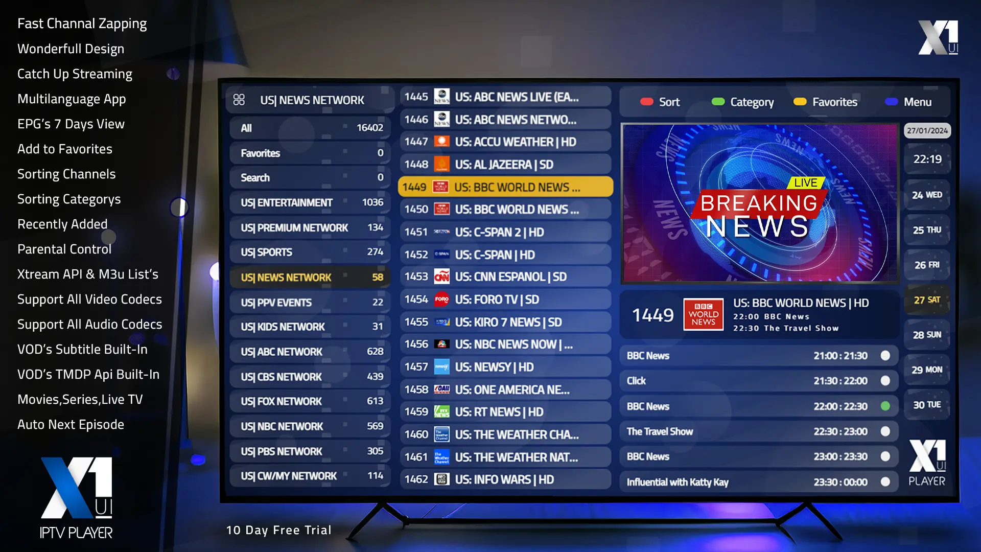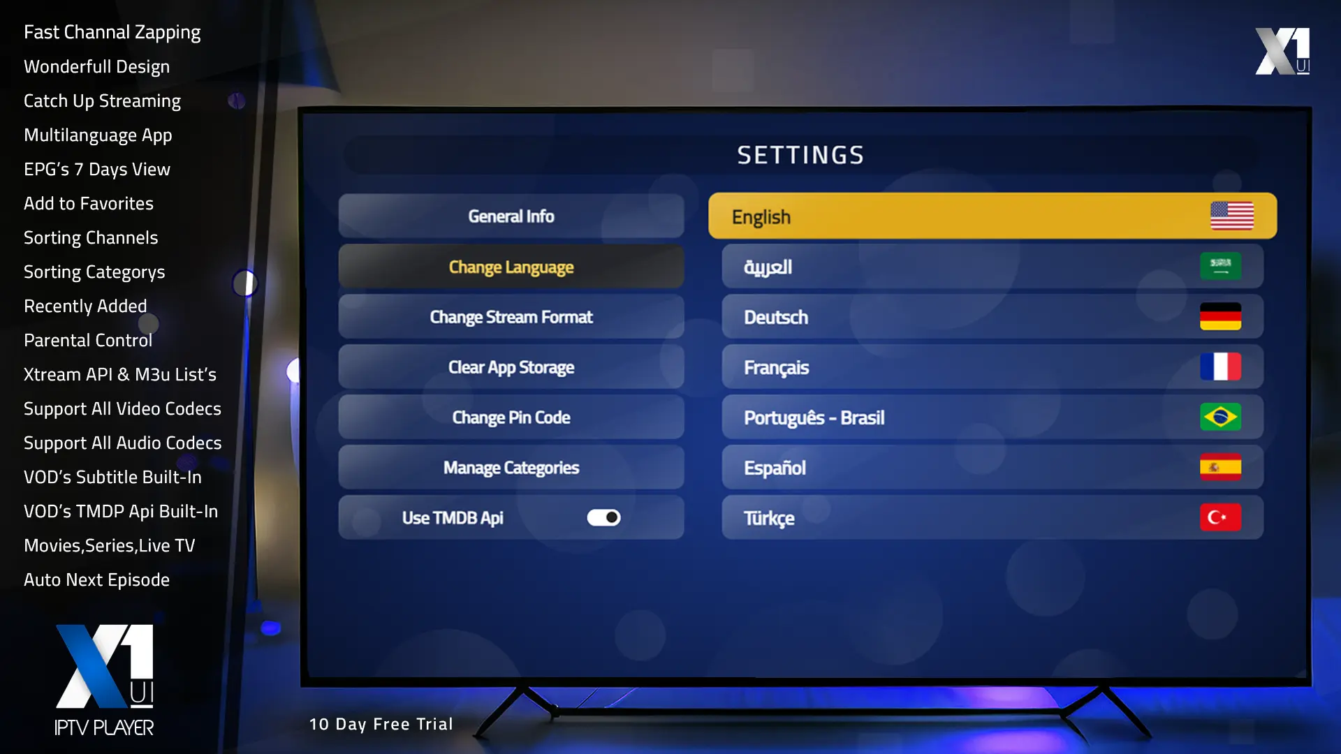 Bu XUI Player uygulamasının kullanımı kolaydır ve güçlü bir medya oynatıcısı, çekici ve çok etkileyici düzeni ile oldukça verimlidir ve en önemlisi kanalları ve VOD’ları çok hızlı zaplama özelliğine sahiptir. ve 10 Günlük Ücretsiz Yol…!